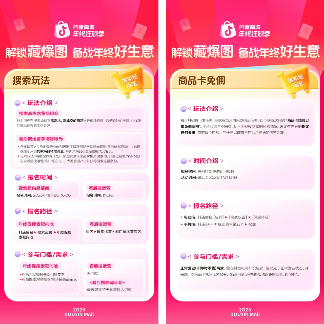 年终消费旺季将至,「2025抖音商城年终狂欢季」也将在12月3日正式启动。这不仅是商家冲击年度目标的关键节点,也是布局新增长的黄金窗口。为助力商家把握增长机遇,活动发布年终大促“藏爆图”,从价格力、内容力、爆发力、营销力等多个维度,为商家备战「2025抖音商城年终狂欢季」提供清晰指引,助力商家在激烈竞争中赢得确定性增长。